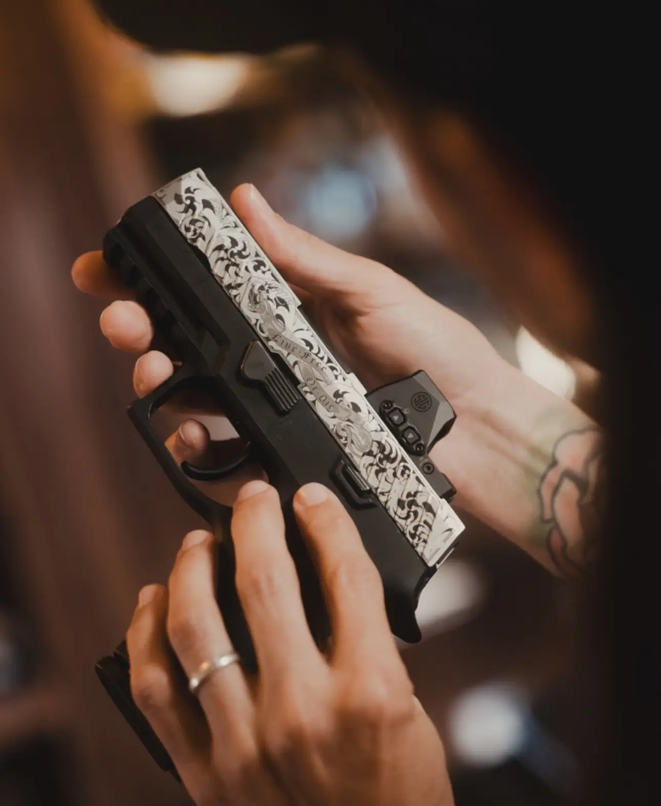 The first limited-edition run of SIG INK slides are available at the SIG Experience Center. This P320-M18 slide was designed exclusively for SIG SAUER by the famous award-winning tattoo artist, Gian Karle.